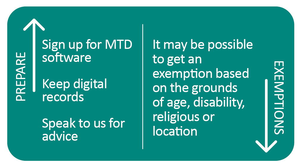 HMRC won’t sign taxpayers up automatically. If Making Tax Digital (MTD) for Income Tax is going to apply to you, we will be in touch to discuss what’s needed in more detail. We can also talk through the options for record keeping, and quarterly filing, so you can decide how much input you would like us to have, and how much you want to tackle yourself. These are the steps that need to be considered: