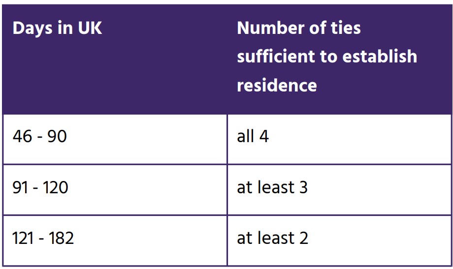 An individual who has been resident in the UK in any of the three preceding tax years must consider all five ties and they will be resident if any of the following apply: